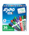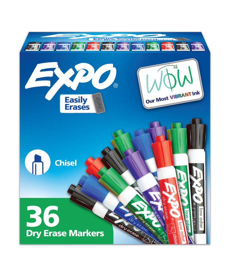 Expo Low Odor Dry Erase Markers feature vivid ink that's easy to see from a distance and provides consistent color quality. These Expo dry erase markers erase cleanly and easily from whiteboards and other nonporous surfaces with a dry cloth or Expo eraser. The dry erase marker ink is specially formulated to be low-odor making it perfect for use in classrooms, offices and homes. Use your colorful Expo dry erase markers to track, schedule and present. Pack of 36: 8- Black, 8- Red, 8- Blue, 8- Green and 4- Purple.