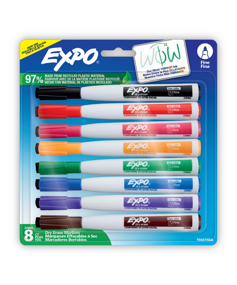- Includes: 1 Black, 1 Green, 1 Blue, 1 Red, 1 Pink, 1 Purple, 1 Orange and 1 Brown fine tip dry erase marker