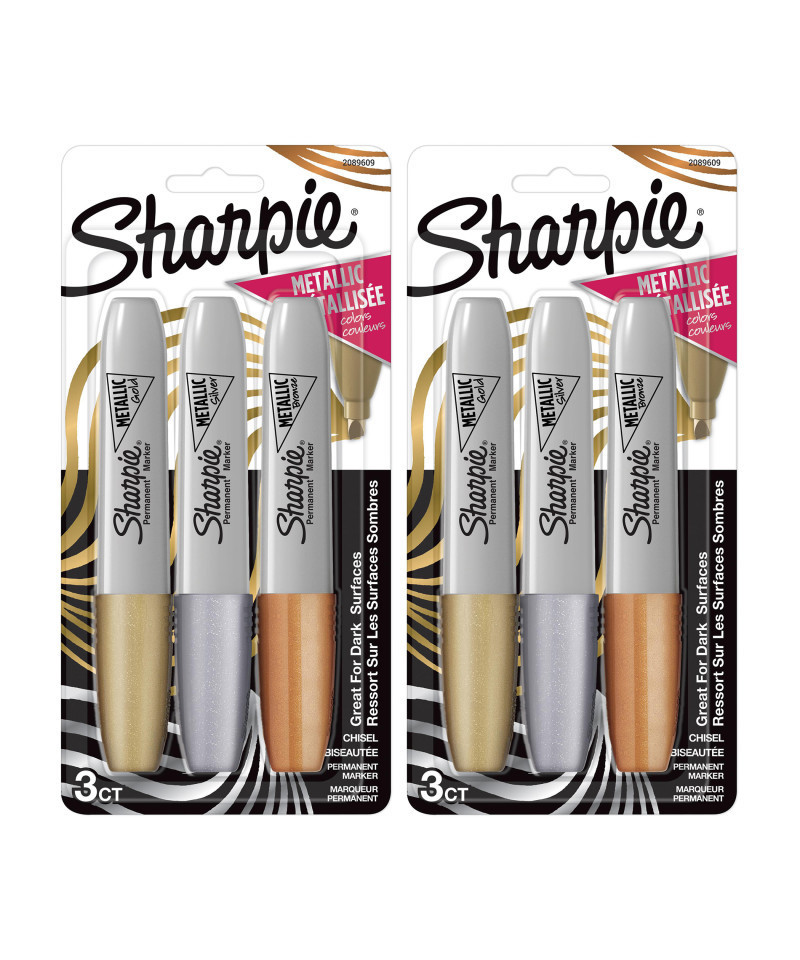 Get your shine on with Sharpie Metallic Permanent Markers. With a versatile chisel tip, create fine lines and thick marks with major style. Stand out in a crowd by using these metallic permanent markers for hand-lettering, coloring, labeling, and crafting. Each permanent marker is made with specially formulated ink designed to be quick-drying and fade- and water-resistant. Every mark boldly stands out on light and dark surfaces, meaning they're perfect for projects on a black background. Each pack includes 3 markers. Sold as 2 packs for a total of 6 markers.