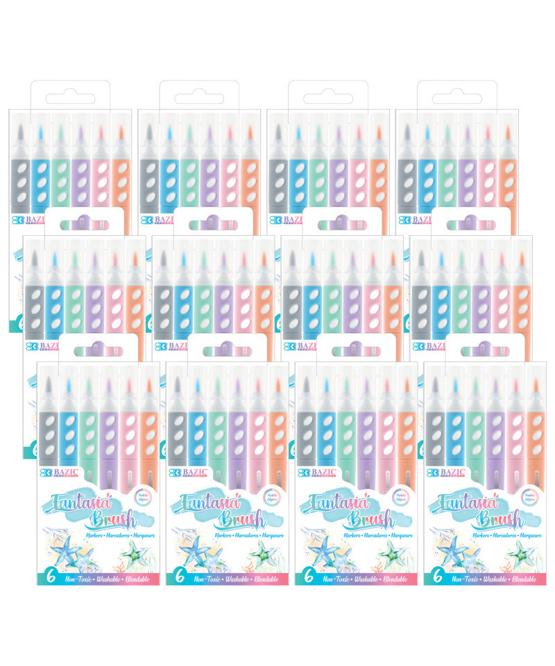 The smooth flow of brush pens accommodates all graphic styles, with no duplicates, no bleed, quick-dry. Perfect for coloring books, card making, DIY, painting, drawing, hand-lettering, and design animation. Brush tip for shading and coloring. 0.4 mm fine point tip for outlining and detail. No trouble with smudging or bleeding, no ink flow issue or skipping. Works well for writing, doodling, and calligraphy. Each pack includes 6 brush markers in pastel colors. Sold as 12 packs for a total of 72 markers.