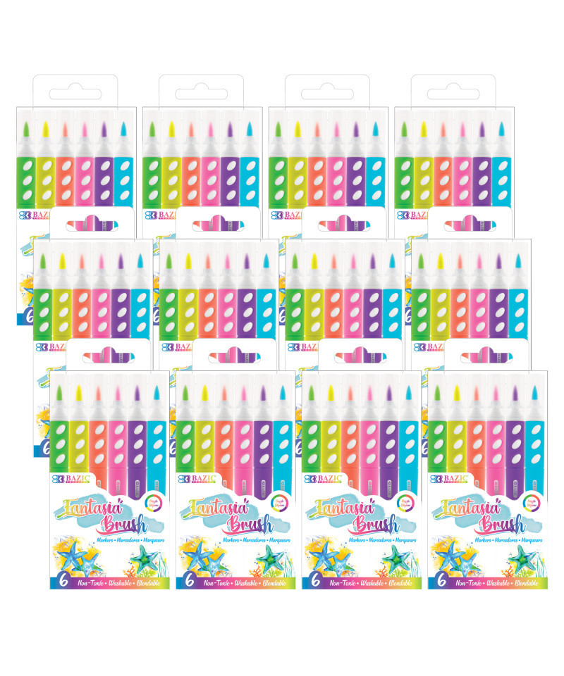The smooth flow of brush pens accommodates all graphic styles, with no duplicates, no bleed, quick-dry. Perfect for coloring books, card making, DIY, painting, drawing, hand-lettering, and design animation. Brush tip for shading and coloring. 0.4 mm fine point tip for outlining and detail. No trouble with smudging or bleeding, no ink flow issue or skipping. Works well for writing, doodling, and calligraphy. Each pack includes 6 brush markers in fluorescent colors. Sold as 12 packs for a total of 72 markers.