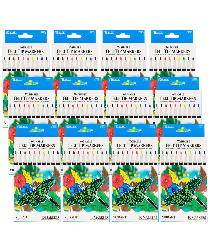 These water-based markers have a durable 2.5mm fiber tip for precise and detailed coloring. Fine line tips ensure precision while coloring in small areas of intricate designs. Excellent smudge-proof. Smooth flow brush pens accommodate all graphic styles. Perfect for coloring books, card making, and hand-lettering. Quick-dry, no trouble with smudging or bleeding, no ink flow issue or skipping. Stored compactly in clear plastic box. It is convenient for kids to pick out, use, and place it back. Creative art craft supplies present for teachers, kids, friends, Christmas, Thanksgiving, and Birthdays. High-quality ink blends seamlessly to create beautiful coloring effects. Each pack includes 10 markers. Sold as 12 packs for a total of 120 markers.