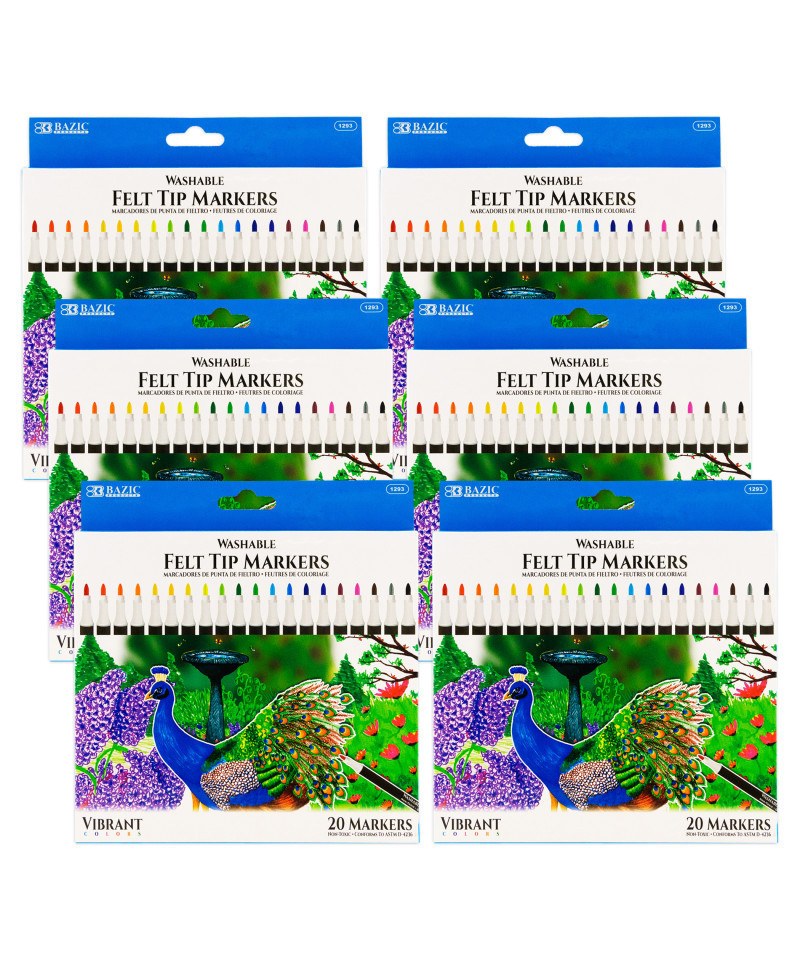 These water-based markers have a durable 2.5mm fiber tip for precise and detailed coloring. Fine line tips ensure precision while coloring in small areas of intricate designs. Excellent smudge-proof. Smooth flow brush pens accommodate all graphic styles. Perfect for coloring books, card making, and hand-lettering. Quick-dry, no trouble with smudging or bleeding, no ink flow issue or skipping. Stored compactly in clear plastic box. It is convenient for kids to pick out, use, and place it back. Creative art craft supplies present for teachers, kids, friends, Christmas, Thanksgiving, and Birthdays. High-quality ink blends seamlessly to create beautiful coloring effects. Each pack includes 20 markers. Sold as 6 packs for a total of 120 markers.