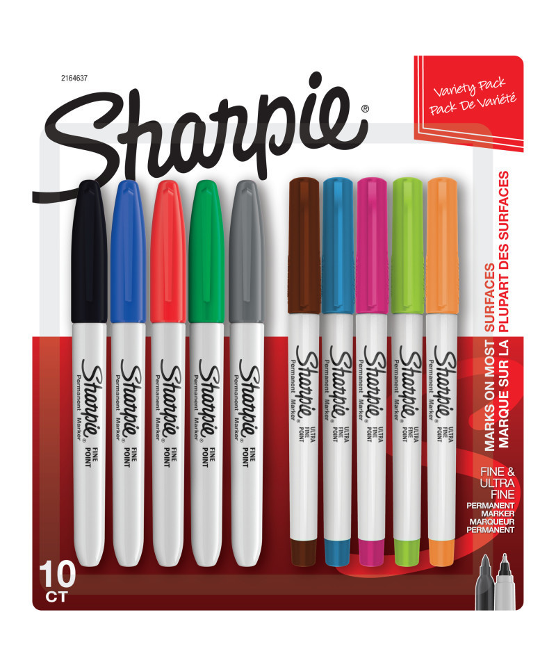 Bold to the max and permanent to the core, Sharpie Permanent Markers inspire you to transform ordinary surfaces into passionately creative statements. Made to write practically everywhere, vivid Sharpie markers eliminate the dull and boring. The original permanent marker, Sharpie has iconic ink that dries quickly and resists both water and fading. While pale imitations wither away, Sharpie markers make creations that endure. This pack contains fine point markers built for jaw-dropping marks and ultra-fine point markers for extreme control. Whether in school or at home, Sharpie Permanent Markers inspire you to tell your whole story. Each pack includes 10 Sharpie markers: 5 Fine Point Markers in Black, Blue, Red, Green and Dark Matter Gray and 5 Ultra Fine Point Markers in Brown, Peacock Blue, Berry, Lime and Tangerine