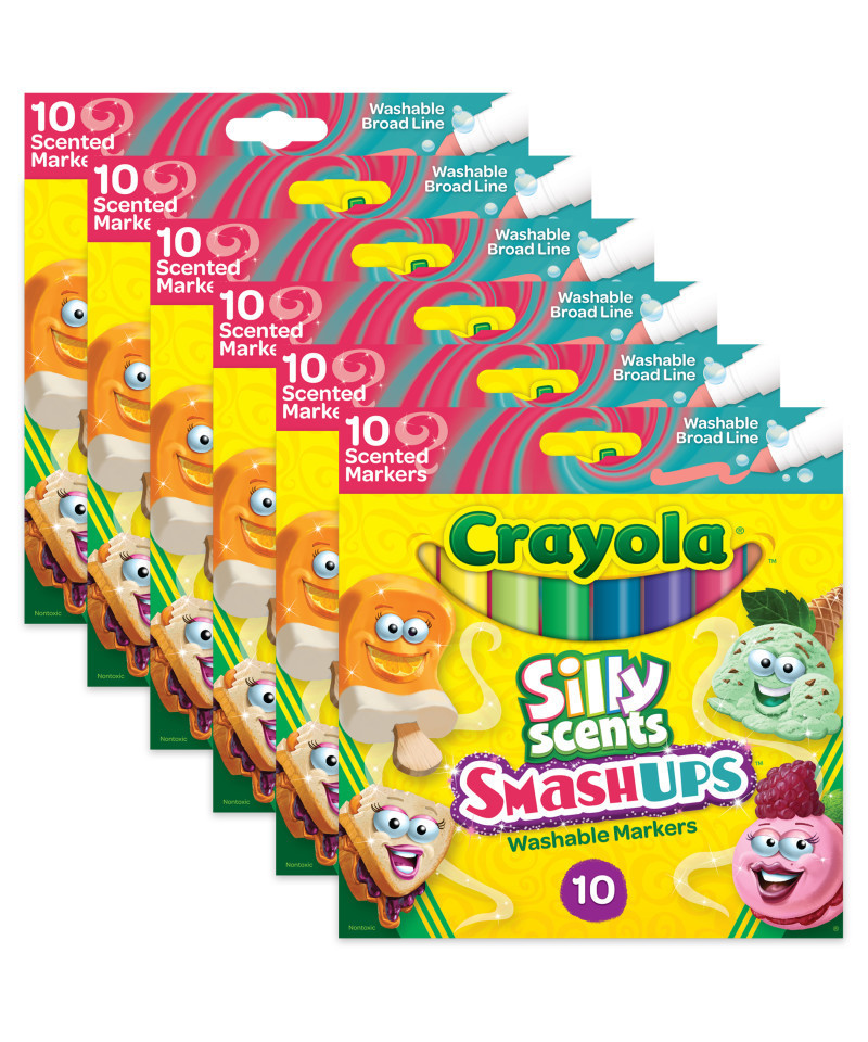 - CRAYOLA SILLY SCENTS ART MARKERS: Sold as 6 packs, each pack includes 10 Broad Line Scented Markers with sweet scent Smash Ups!