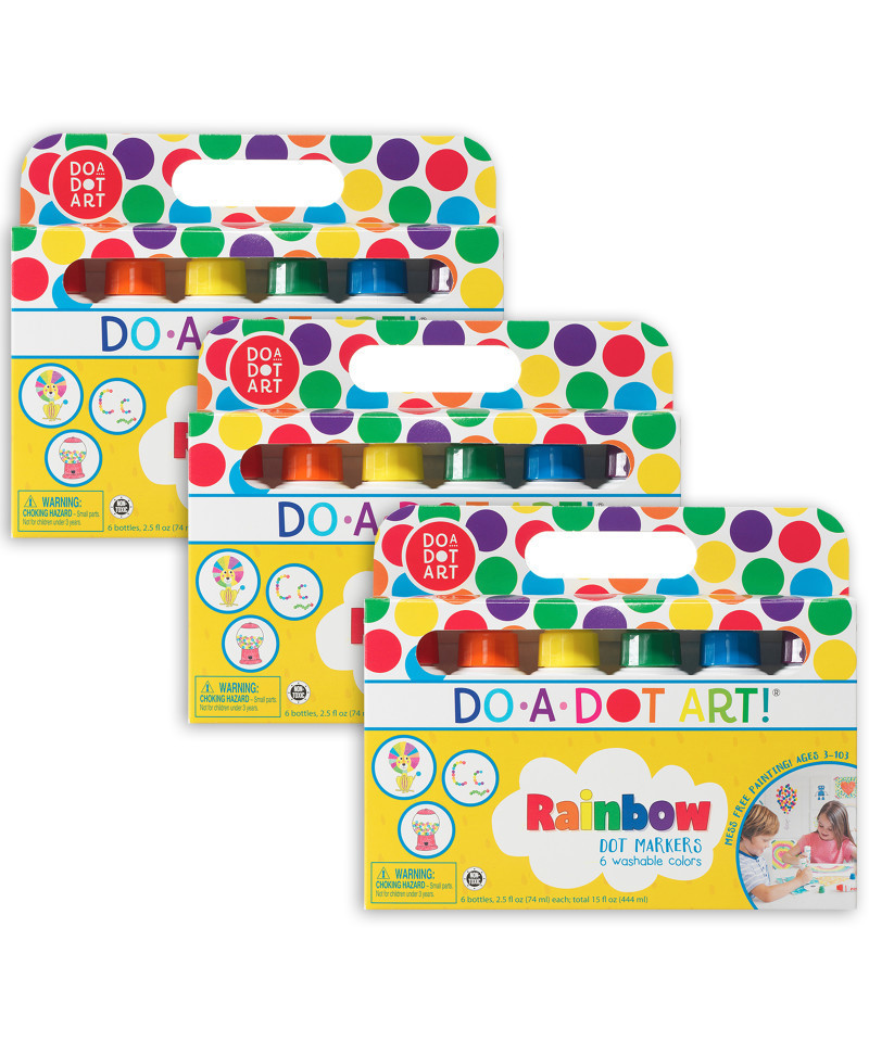 Explore what's over the rainbow and dot away with this set of Do A Dot Art! Rainbow markers. Arts and crafts time just got easier and cleaner with Do A Dot Art! Each pack comes with 6 washable dot markers in no spill, no splash bottles, which is a dream come true for parents and teachers. Do A Dot Art! is incredible for developing hand eye coordination and color recognition for young children, and is the first art medium every young child should use. Let your imagination run wild with this set of primary rainbow colors. Each pack includes: Red, Orange, Yellow, Green, Blue, and Purple. Washable with easy set-up and easy clean up. Dries quickly. Sponge tips never dry out. Easy to grip bottles for little hands. Special formula allows you to mix, blend, and layer color. Each marker contains 2.5 ounces of ink. Made in the USA. Sold as 3 packs for a total of 18 markers.