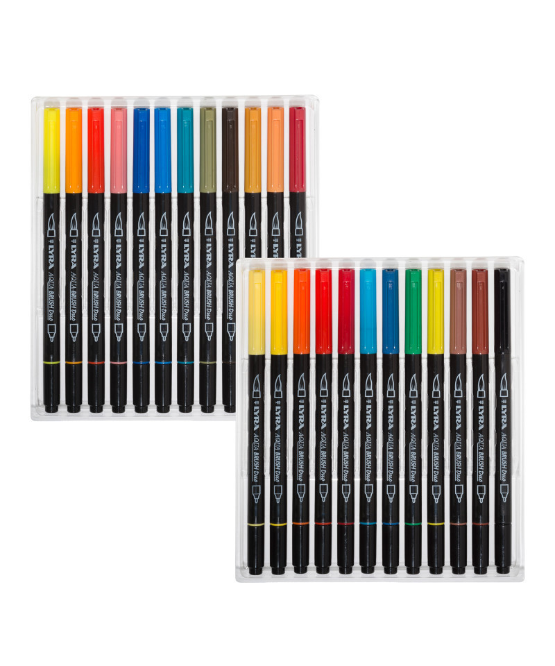 Lyra artist supplies are superior products for serious artists of all ages. Lyra Aqua Brush Duo is a pen with a brush-on effect especially made for artists, designers, and hobby painters. The unique tips are extremely stable. There is a broad tip on one side which allows brush-like techniques. Fine lines and drawings are easy to do with the tip on the other side of the Aqua Brush Duo. With this brush pen pictures and layouts can be done to perfection. The ink is water based and AP certified non-toxic. Draw, sketch design and empower your creativity with artist products from Lyra. The 24-color set includes Light Yellow, Lemon Yellow, Orange, Pale Geranium Lake, Deep Carmine, Light Blue, Prussian Blue, Permanent Green, Yellow Still de Grain, Van Dyck Brown, Venetian Red, Black, Cadmium Yellow, Cadmium Yellow Deep, Saturn Red, Rose Carmine, Cobalt Blue Light, Cerulean, Night Green, Chrome Green, Deep Sepia, Cold Ochre, Pompeian Red, Burnt Ochre. Content may vary. ACMI Certified, Conforms to ASTM D-4236.