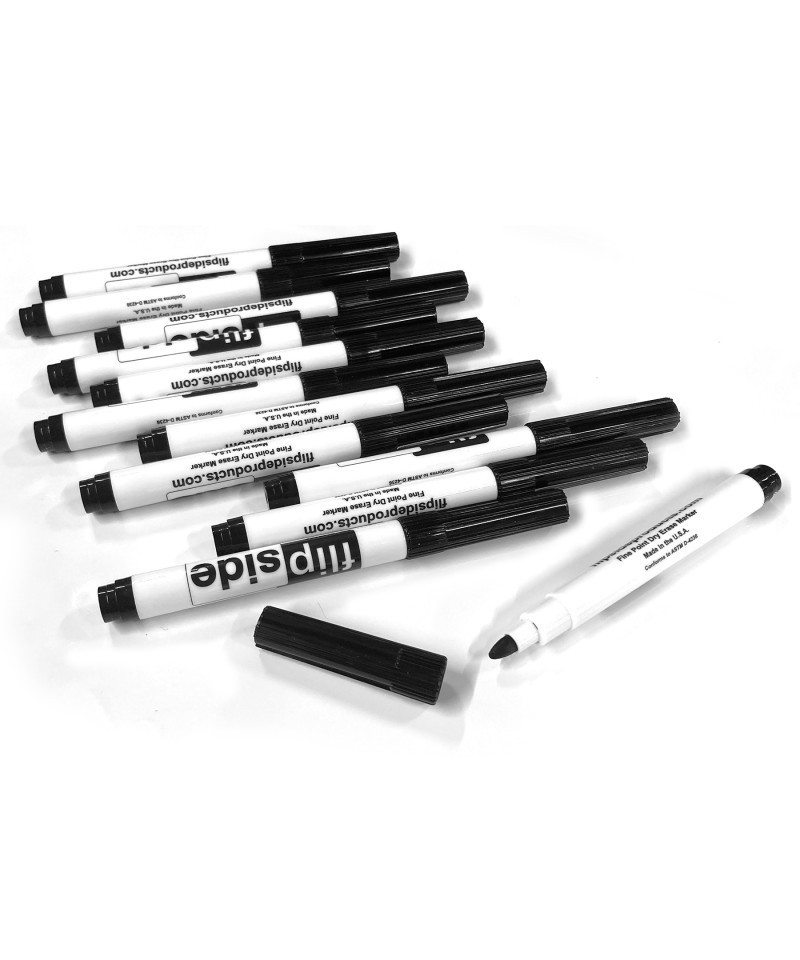 Dry Erase Markers are ideal for all your dry erase board needs! Classic black ink in a fine point marker erases easily with felt erasers or a cloth. Non-toxic ink is low odor for use by all ages. Pen measures 5.5" long x 0.375" diameter. Pack of 12.