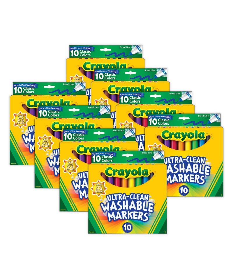 Now with ColorMax™, our brightest, truest colors yet! Kids love to get creative with color, but parents want to keep the color where it belongs and easily remove it where it doesn't! The world's most washable non-toxic broad line markers now come in an improved Ultra-Clean formula that washes easily from skin, clothing, and walls. Washability you can trust from the world's most washable marker. Broad Line Markers provide artists with 10 classic Crayola colors that feature Color Max – our brightest, truest colors yet. Amp up school projects and artistic endeavors with high-quality ink that is true to color. The variety of bright, classic colors in this pack invites imaginative expression. With its conical tip, the Crayola Broad Line Marker is a versatile drawing tool. Perfect for coloring in large areas, these markers are also great for drawing thin lines or dots. Kids can even create a ribbon effect with lines that taper from thick to thin. Broad line markers lay down plenty of color and won't smudge or bleed through paper. The world's most washable non-toxic markers now come in an improved Ultra-Clean formula that washes easily from skin, clothing, and common household surfaces—even painted walls. Each pack includes 10 markers. Sold as 8 packs for a total of 80 markers.