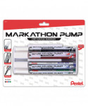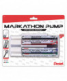 Markathon Pump is the only dry erase marker that will never dry out, even when left uncapped. Markathon Pump features a unique Inkjector Pump system. Simply place the cap on the back of the marker, and press to refresh ink flow. Markathon Pump uses rich vibrant ink that works perfectly with dry erase boards and glass surfaces. Firm chisel tip writes fine to broad lines. Each pack includes markers in assorted colors and an eraser.