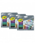 Bring sparkle & shine to your art projects and crafts with Crayola Metallic Markers! Each 8 count Metallic Marker set includes Purple Steel, Gold Ingot, Pink Bling, Black Iron, Cobalt Blue, Slick Silver, Green Machine, and Copper Mine. These versatile markers work on a variety of surfaces such as Construction Paper, Poster Board, and Regular Paper. Add details that pop on light and dark surfaces creating definition in your artwork that catches the eye. From back-to-school supplies to seasonal crafts and creative play, these markers make a terrific addition to any color collection at home. Ideal for kids and fans of adult coloring, they are nontoxic and safe for ages 3 & up. Sold as 3 packs for a total of 24 markers.