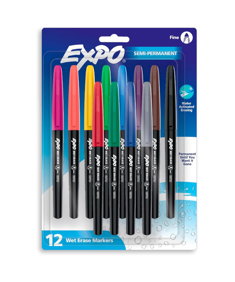 Label, plan, and organize with ease with EXPO Wet Erase Markers. Depend on EXPO wet erase markers for writing or drawing on whiteboards, hard plastic, laminated sheets, and other nonporous surfaces. These EXPO markers feature ink that easily wipes off with a damp cloth. Available in a variety of vibrant colors, the fine-tip markers leave fine detailed lines even in small spaces.