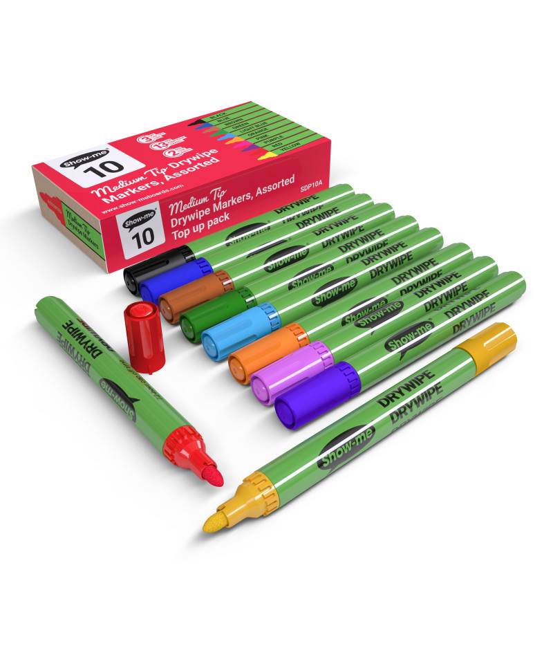 Show-me dry erase markers are purpose-built for the classroom and trusted by thousands of schools worldwide. Designed with young learners in mind, each marker features a Komfigrip slim barrel that fits comfortably in small hands, making them ideal for frequent use in busy educational environments. The extra-hard nib resists splaying, while a clever nib-stop prevents the tip from being pushed into the barrel, ensuring long-lasting performance. Safety is a top priority—these markers use low-odor, xylene-free ink and are equipped with airflow caps to reduce risk if accidentally swallowed. With a 72-hour cap-off time, they resist drying out even if left uncapped. This pack contains 10 medium tip dry erase markers in assorted colors, combining durability, safety, and functionality in every stroke.