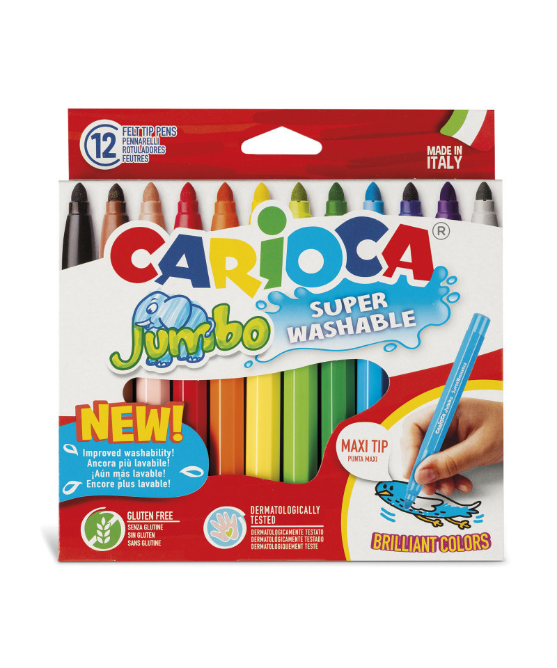 The Carioca Jumbo Maxi Tip Felt Tip Pens – 12 Pieces are classic art markers designed for bold, vibrant coloring. Featuring a 6 mm blocked tip, these markers deliver smooth, consistent lines, ideal for both school projects and creative artwork. The maxi octagonal body ensures a comfortable grip for children and adults alike, while the super washable ink makes cleanup easy, even from skin and most fabrics. Each marker comes with a ventilated cap for added safety, and the set is proudly Made in Italy, reflecting high-quality craftsmanship. Perfect for classrooms, home use, or art studios, this set combines practicality, safety, and rich color performance.