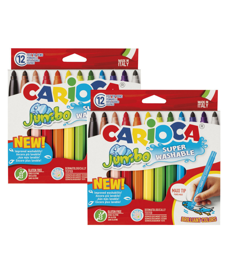The Carioca Jumbo Maxi Tip Felt Tip Pens – 12 Pieces are classic art markers designed for bold, vibrant coloring. Featuring a 6 mm blocked tip, these markers deliver smooth, consistent lines, ideal for both school projects and creative artwork. The maxi octagonal body ensures a comfortable grip for children and adults alike, while the super washable ink makes cleanup easy, even from skin and most fabrics. Each marker comes with a ventilated cap for added safety, and the set is proudly Made in Italy, reflecting high-quality craftsmanship. Perfect for classrooms, home use, or art studios, this set combines practicality, safety, and rich color performance. Each pack includes 12 markers. Sold as 2 packs for a total of 24 markers.