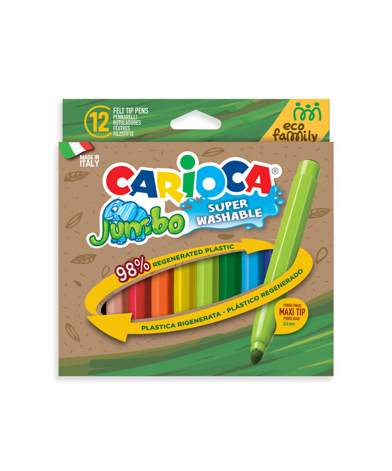 The Carioca Eco Family Jumbo Maxi Tip Felt Tip Pens – 12 Pieces are the perfect blend of creativity and sustainability. Crafted from 98% regenerated plastic, these eco-friendly markers deliver vibrant colors while helping reduce environmental impact. The super washable ink makes cleanup easy from skin and most fabrics, while the maxi 6 mm blocked tip ensures durability and bold strokes. A ventilated cap provides added safety, making them ideal for classrooms, home projects, and creative activities. Proudly made in Italy, these markers are a responsible choice for artists of all ages.