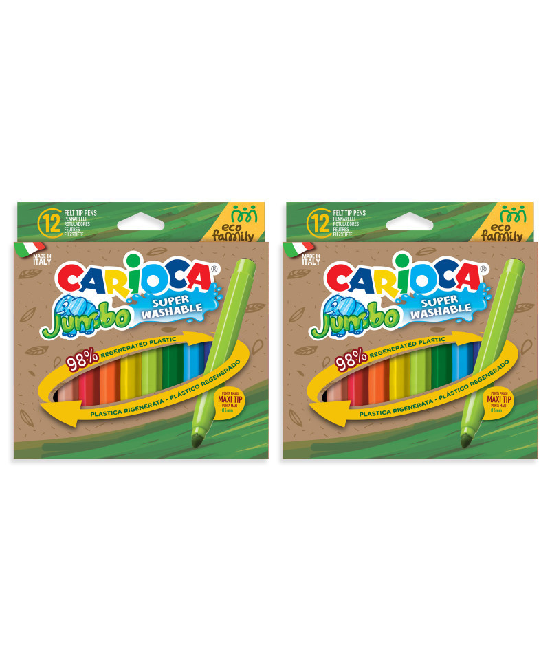 The Carioca Eco Family Jumbo Maxi Tip Felt Tip Pens – 12 Pieces are the perfect blend of creativity and sustainability. Crafted from 98% regenerated plastic, these eco-friendly markers deliver vibrant colors while helping reduce environmental impact. The super washable ink makes cleanup easy from skin and most fabrics, while the maxi 6 mm blocked tip ensures durability and bold strokes. A ventilated cap provides added safety, making them ideal for classrooms, home projects, and creative activities. Proudly made in Italy, these markers are a responsible choice for artists of all ages. Each pack includes 12 markers. Sold as 2 packs for a total of 24 markers.