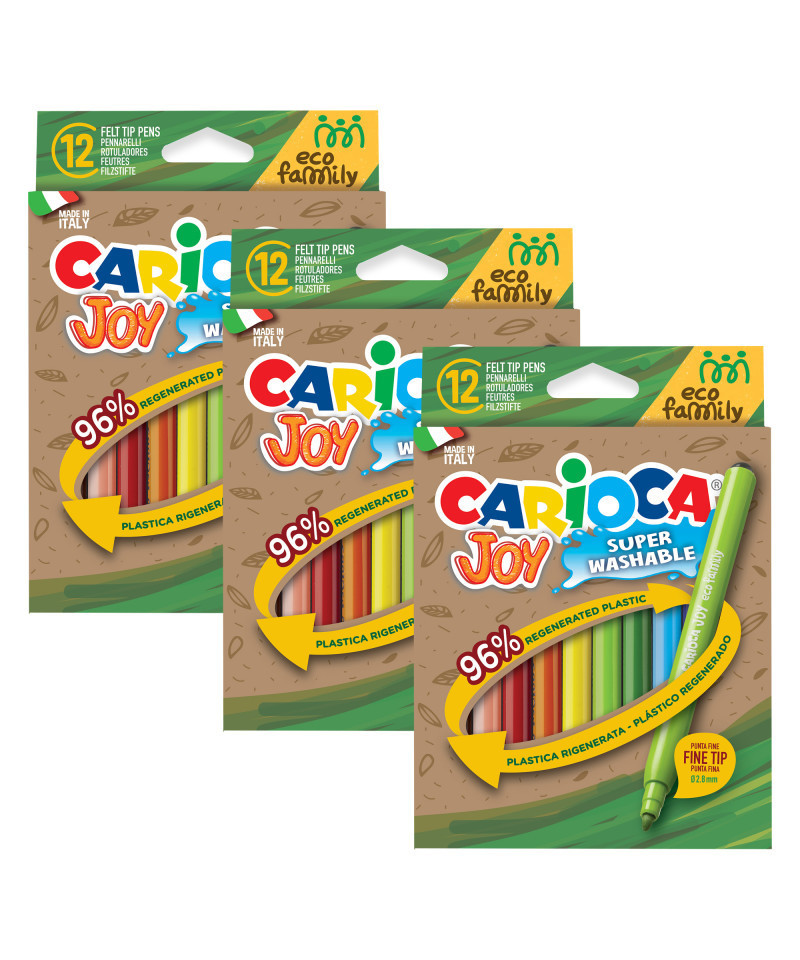 The Carioca Eco Family Joy Fine Tip Felt Tip Pens – 12 Pieces combine eco-conscious design with vibrant, precise coloring. Made from 98% regenerated plastic, these markers are an environmentally friendly choice for artists of all ages. The fine 2.8 mm blocked tip is perfect for detailed work while remaining durable for long-lasting use. With super washable ink, cleanup from skin and most fabrics is quick and easy, and the ventilated cap adds an extra layer of safety. Proudly made in Italy, these markers deliver quality, precision, and sustainability in every stroke. Each pack includes 12 markers. Sold as 3 packs for a total of 36 markers.