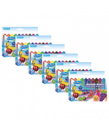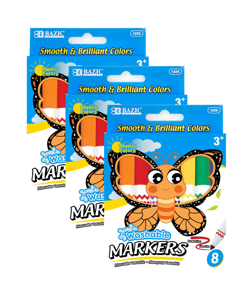 Bring your creativity to life with these Broad Line Washable Markers, perfect for coloring, drawing, and writing on a wide variety of surfaces. Featuring a durable conical tip, each marker allows for both fine lines and bold strokes, making them ideal for everything from detailed illustrations to vibrant posters. The quick-drying, smear-free ink won’t bleed through most papers—even thinner ones—and the sturdy tips can withstand heavy pressure and rough use. These water-based markers are safe for kids and easy to wash out of most clothing with warm or hot water (no bleach needed). Ideal for use in schools, offices, or at home, these versatile markers make a fun, colorful addition to any art or supply kit. Sold as 3 packs of 8 markers each.