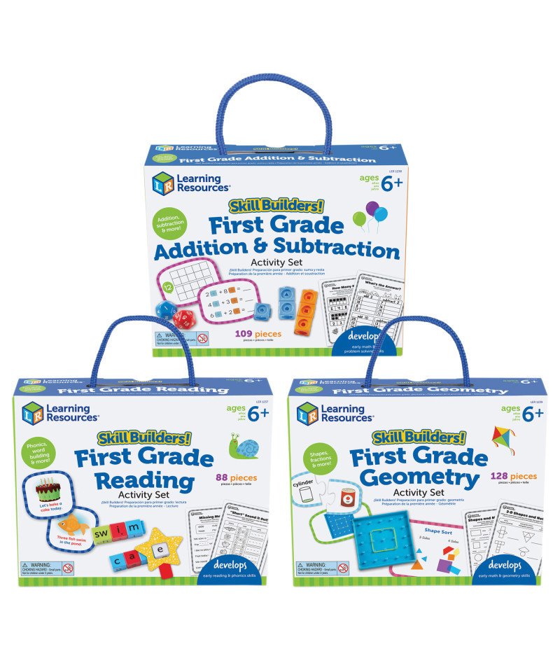 Play your way to classroom-ready skills! Set your kids on the path to elementary school success with the fun, quick activities found in the first grade learning materials in Skill Builders! This Skill Builders! 1st Grade Activity Set 3-Pack includes Reading Activity Set, Addition & Subtraction Set, and Geometric Shapes Set. The Reading Set helps students learn essential language skills, from long and short vowels to high-frequency words and more! The Additions & Subtraction Set helps students learn essential math skills, whether they're building with MathLink Cubes or working with ten frames! The Geometric Shapes Set helps students learn essential math skills, from symmetry to 2-D and 3-D shapes and more!