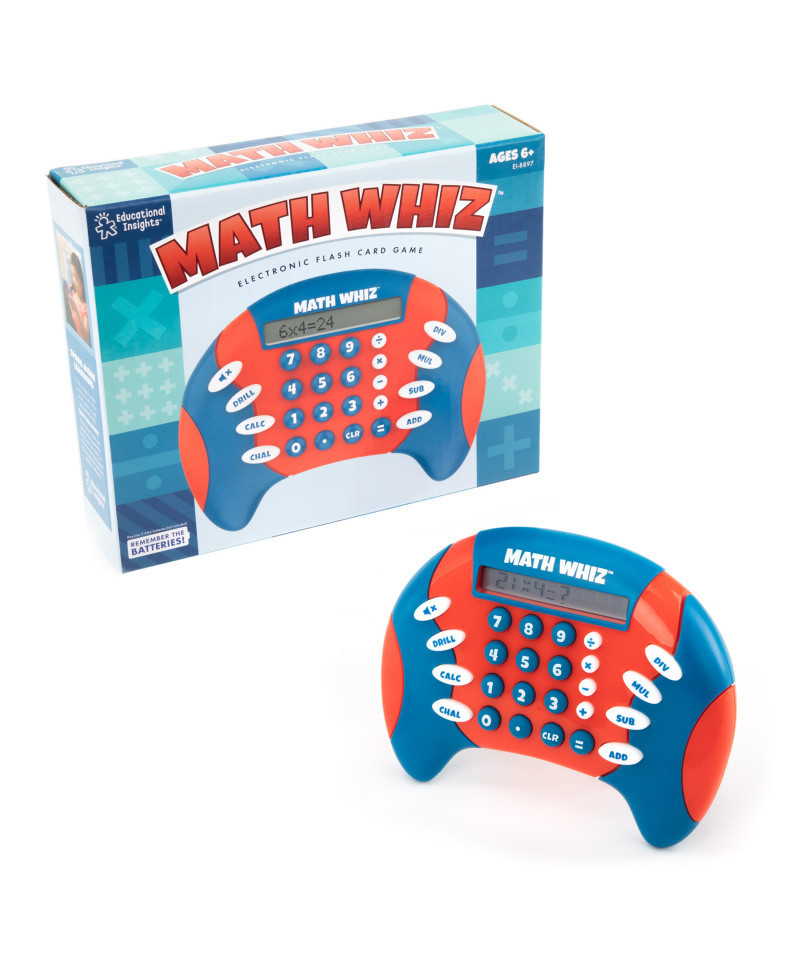 - WHAT'S INCLUDED: Math Whiz is a hand-held electronic game with three modes of play (Drill, Challenge, and Calculator) that quizzes kids on addition, subtraction, multiplication, and division facts at 8 difficulty levels for each skill. Requires 2 AAA batteries (not included).