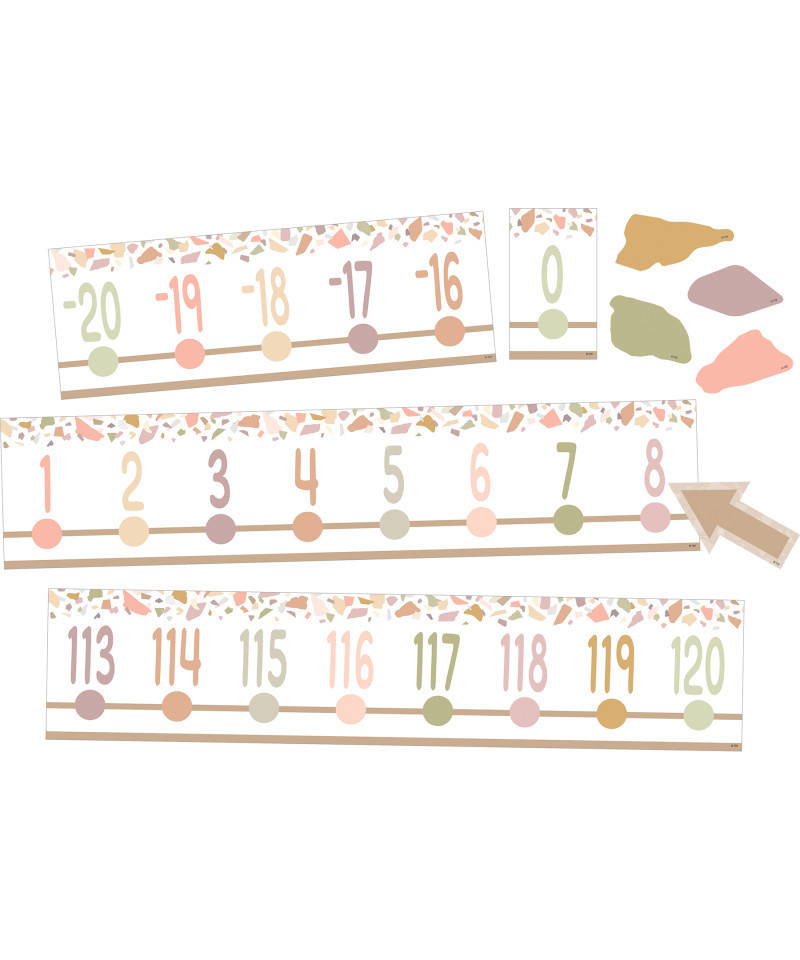 - Features: 19 number line pieces, 4 terrazzo accents and 1 arrow accent, Bulletin board guide with set-up and activity suggestions.
