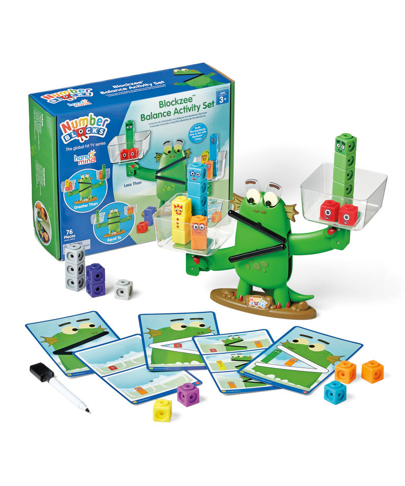 Watch Blockzee™, the lovable monster from the global hit TV series Numberblocks, move her eyes, arms, and mouth to compare numbers! This highly engaging balance features clear, sturdy buckets to hold multiple Numberblocks that children can easily see. Colorful, language-free activity cards guide children through foundational math skills such as number identification, number comparison, counting, and simple addition. Children will also practice building their fine motor skills through interactive, character-led play with this sturdy set. Includes 1 Blockzee Balance with 2 clear buckets, 61 MathLink Cubes, 10 Double-sided Activity Cards, 1 Activity Guide, 1 Sticker Sheet, and 1 Dry-erase Marker.