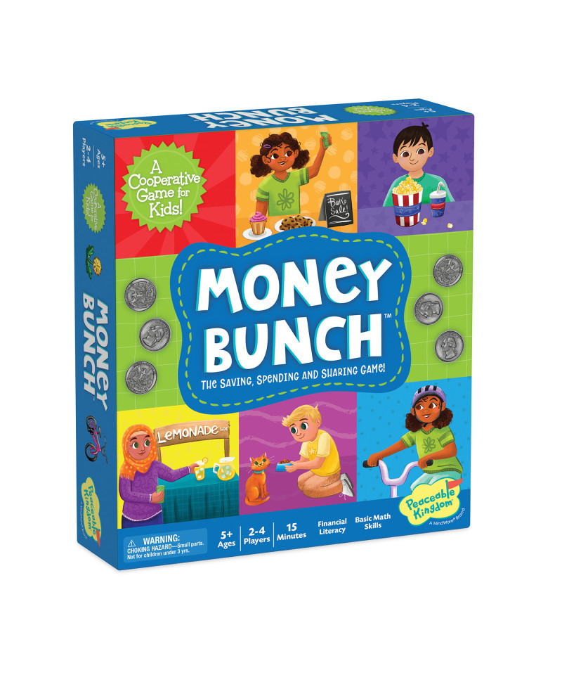 Money Bunch, the Money Saving, Spending and Sharing Game! This exciting board game features an irresistable combination of playful learning and heartwarming team spirit. As players journey around the board on their bikes, they encounter opportunities to earn, save, share and spend money, bringing financial wisdom to their imaginative play. Culminating in a cooperative mission as they use their shared money to purchase playground equipment for the community, this game not only enriches players with financial savvy but also fosters a sense of teamwork and beneficial community impact. Watch profits grow as this empathetic gameplay resonates with families in your community! For 2-4 players, ages 5 and up.