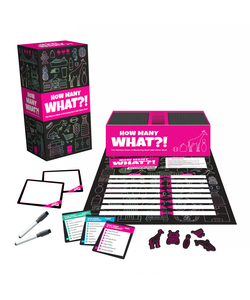 Some people will use anything but the metric system to measure things! How Many What?! is the ridiculous party game of absurd comparisons. Anyone can play: Simply guess the size of one thing measured in something completely random and compare your answer to the other players. Rank the answers in order and vote. Even if you don't guess the closest answer, you can still gain points by choosing which of the other players' guesses was most accurate!
