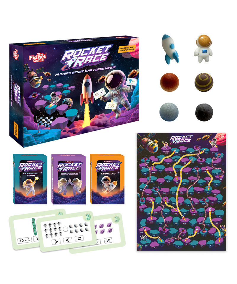 Blast off into math mastery with Rocket Race! Designed for kids ages 5–8, this fast-paced educational board game helps children build number sense, master place value from ones to hundreds, and strengthen comparison skills using greater than, less than, and equal to challenges. With three interactive card packs—Counting, Comparing, and Expanded Form—plus colorful squishy pawns, players race to space #100 while practicing essential early math skills. Perfect for classrooms, homeschool, tutoring, or family game night, Rocket Race engages visual and tactile learners through hands-on play that makes math exciting and accessible. Aligned to early grade math standards, this STEM game supports children of all abilities, including those with ADHD, autism, or dyscalculia, while boosting fluency and confidence. Backed by research and designed to be fun, Rocket Race turns learning math into an adventure kids will want to play again and again.