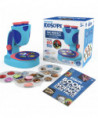 - ZOOM IN ON 60 UNIQUE IMAGES: Place one of 15 printed slides on the rotating dial stage, spin to focus in on one of four images per slide, then adjust the easy-focus knob to view up to 3x larger. This fully functional slide microscope includes a rotating dial stage, double-eye viewer, LED light for enhanced viewing, and storage drawer to keep slides safe. Includes detailed science guide with over 200 facts. Requires 3 AA batteries (not included).