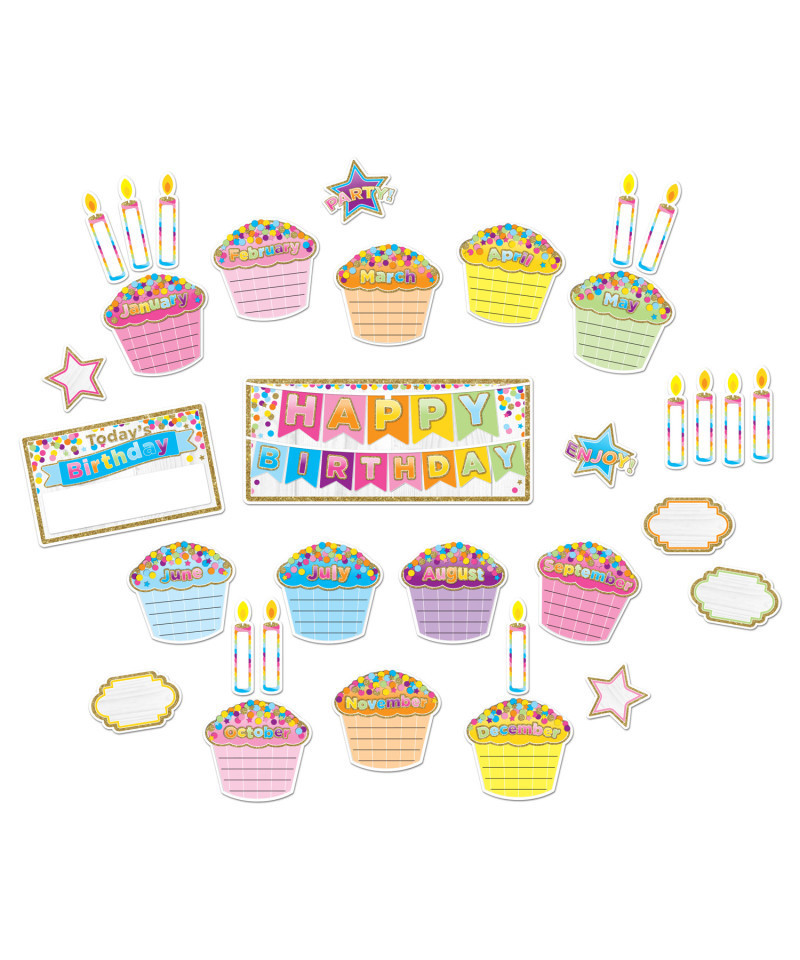 Smart Poly® Birthday Mini Bulletin Board Set includes 33 pieces in a Confetti design. Made from a long lasting plastic material that does not require lamination. The surface is write-on wipe-off with dry erase or water based markers. Washable and easy to clean.