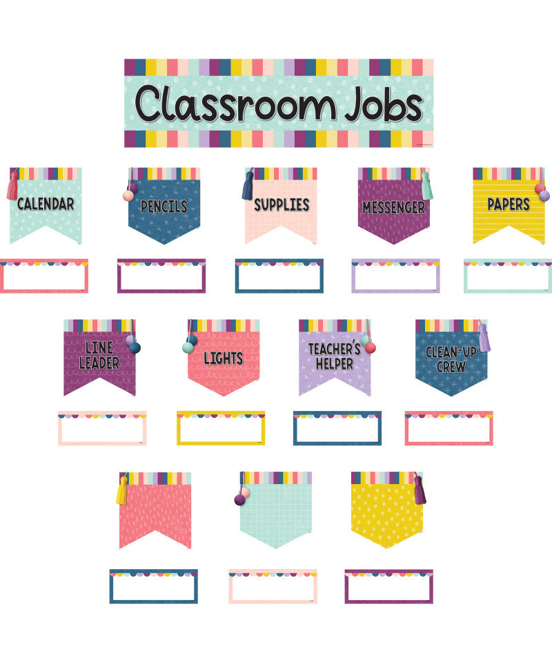 Add a stylish, upbeat touch to your classroom with this fun and funky classroom jobs display. Header piece measures 21" x 6". 49 total pieces.