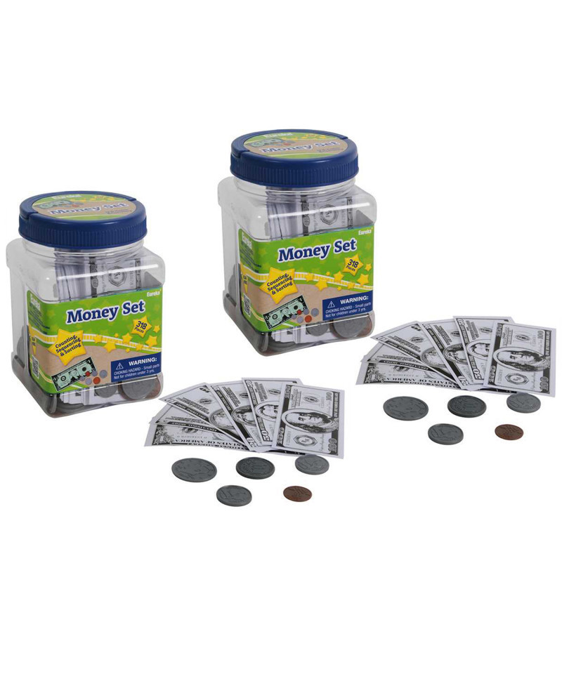 Eureka Manipulatives are great for teaching early childhood learning and a great tool in helping students recognize connections within each educational topic. Teaches number sense, estimation and value of money. Each pack includes 318 pieces: 243 plastic coins in pennies, nickels, dimes, quarters, half dollars and $1 coin denominations, and 75 sheets of U.S. Currency (25-$1, 15-$5, 15-$10, 10-$20, 5-$50, and 5-$100). Sold as 2 packs for a total of 636 pieces.