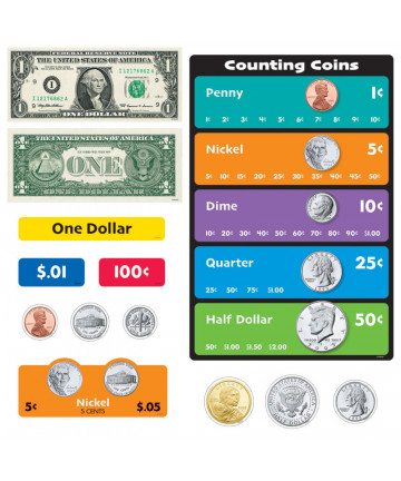 This set of play money includes 105 bills and 94 coins. Give children a hands-on method to practice fundamental math and financial literacy concepts that will last a lifetime. Count change, sort bills and coins, conduct educational transactions, and more. These play coins and bills are the approximate size and color of real dollar bills and coins. They also feature double-sided, realistic illustrations. Packaged in a resealable bag, take these tools anywhere. Includes 35 ones, 25 fives, 20 tens, 15 twenties, 5 fifties, 5 hundreds, 30 pennies, 20 nickels, 20 dimes, 20 quarters and 4 half dollars. For ages 3+. Size of bills: 6.1"L. Size of quarter: 1" dia.