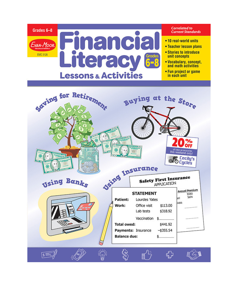 Give sixth grade students important life skills by teaching them about money and financial concepts and how to apply math to the world around them!This dynamic teaching resource provides reproducible cut-out math manipulatives, reference sheets, and visual aids to support students as they explore real-world lessons and hands-on activities related to paying bills, earning money at a job, saving for retirement, making investments, buying and using insurance, and more.