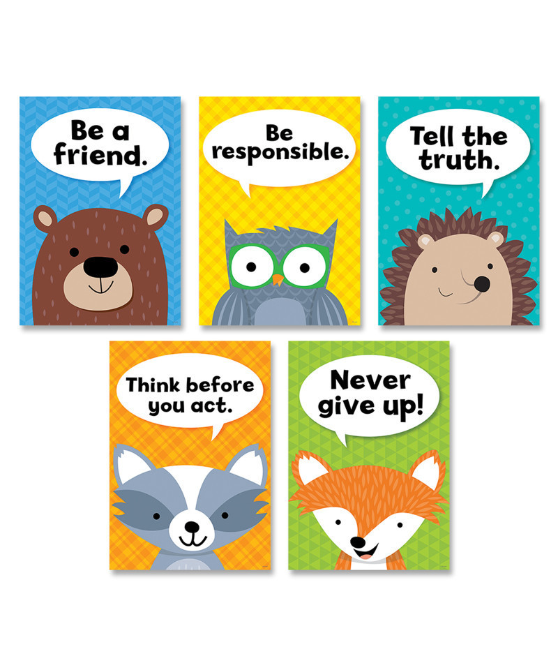 - 13 3/8" x 19", Pack includes 5 motivational posters: Be a friend (bear); Be responsible (owl); Tell the truth (hedgehog); Think before you act (raccoon); and Never give up (fox)