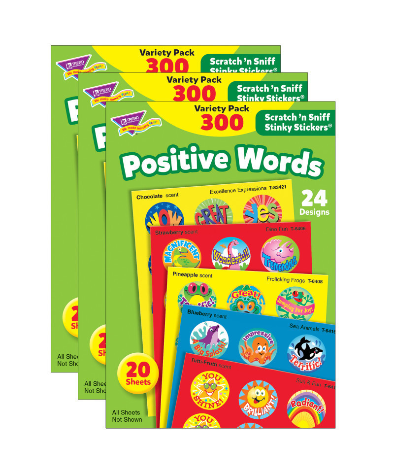 Scratch 'em and sniff 'em for a burst of fragrance! Everyone's favorite stickers, Stinky Stickers are fun to collect or use to motivate and reward. Designs include School Time, Crayons, Excellence Expressions, Dino Fun, Peppermints, Frogs, Sea Animals, and Sun & Fun. Designs may vary. Acid free, nontoxic, and safe for use on photos. 24 designs, 8 scents, 300 sticker per pack. Sold as 3 packs for a total of 900 stickers.
