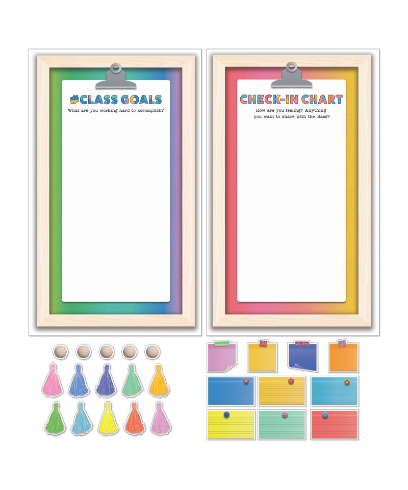 Create an inspiring and organized learning space for students that helps them to reach their goals with Carson Dellosa's Creatively Inspired Classroom Community Bulletin Board Set! The 106-piece bulletin board décor set includes a 15.04" x 26" check-in chart (assembled from 2 pieces), 15.04" x 26" class goals chart (assembled from 2 pieces), 22 assorted 2.03" x 3.18" tassels, 30 assorted 2.76" x 3" sticky notes, 30 assorted 4.4" x 2.74" note cards, and 20 1.4" x 1.4" bead bulletin board cutouts. Each of the bulletin board decorations is made from a durable cardstock material to dress up cork board, white board, growth mindset décor, and other wall décor with ease. Perfect for social-emotional learning, the bulletin board set allows you to record and track goals or things students are working hard to accomplish, as well as feelings or thoughts students want to share with the class to reinforce a positive growth mindset while maintaining classroom organization. The Creatively Inspired collection, designed by Stephanie and Loreal of @HappilyEverElementary, partnered with Carson Dellosa to help create a vibrant, positive, and creative environment that inspires students to learn.