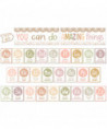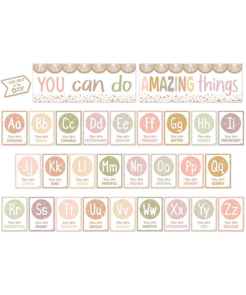 By integrating alphabet cards with uplifting affirmations, this bulletin board becomes the ideal dual-purpose resource for fostering both learning and a growth mindset. Header piece measures 48" x 9". Features: 26 alphabet cards with positive affirmations, 1 "Thought of the day" sign, Bulletin board guide with set-up and activity suggestions. 29 pieces.