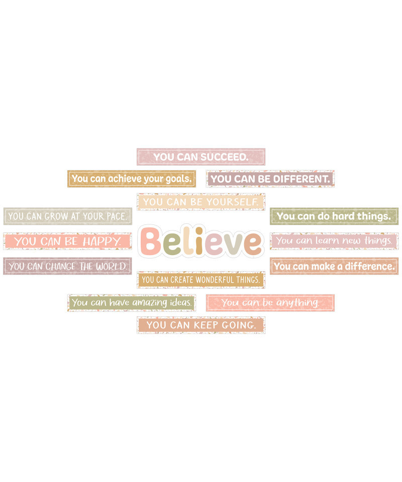 Infuse your learning environment with messages that can fortify positive self-talk with messages in a warm and soothing palette. BELIEVE piece is 20-1/2" x 5-1/2" and each "You can" piece is 20-3/4" x 2-3/4". 15 total pieces. Shiny, protective coating. Features: 1 "Believe" title piece, 14 positive sayings, Bulletin Board Guide with suggestions and activities.