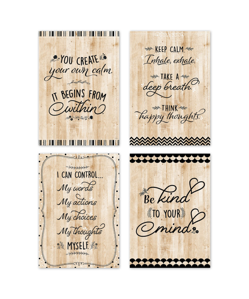 Tips for remaining calm in stressful situations are featured on the charming posters in our Black, White, and Wood Inspire U 4-Poster Pack. Each poster features a helpful reminder with messages ideal for children and adults alike. These posters feature style with black and white core patterns on a neutral wood background are perfect for display in a school, at home or anywhere a little inspiration is needed. Each poster measures 13-3/8" x 19". Pack includes these 4 posters: 10961 You create your own calm..., 10962 Keep calm..., 10963 I can control..., and 10964 Be kind to your mind.