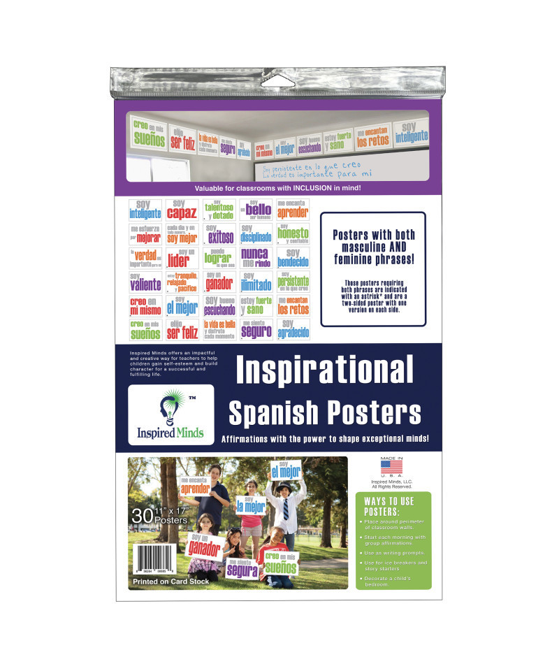 Inspired Minds Spanish Posters are intentional printed simple, yet colorful, to offer an impactful and creative way for teachers to help children gain self-esteem, inner-strength, encouragement, hopefulness, positivity, confidence and build character to last a life time. Surrounding children with affirmations on a daily basis will help develop inner tools to find true happiness and ultimate success.