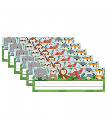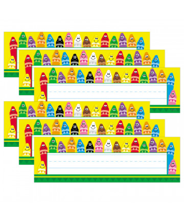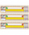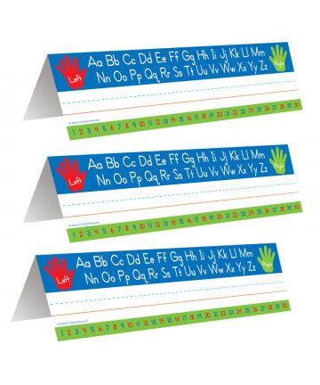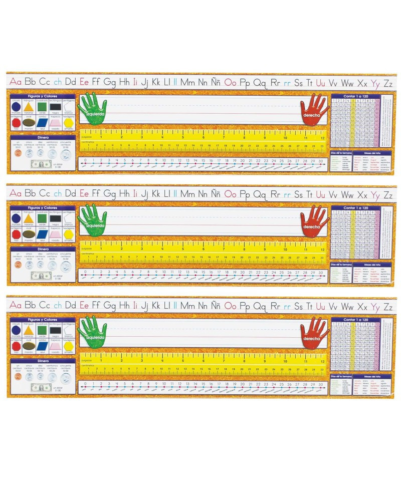 Spanish desk plates include alphabet line, name plate with left and right handprints, 12'' (30 cm) ruler, number line (0 to 30), shapes and colors, money, counting 1-120 chart, days of the week, and months of the year. Desk plates measure 19" x 5" (48.3 X 12.7 cm). Note: although ch (che), ll (elle), and rr (erre) are not separate letters in the dictionary, as established in 1994 by the Royal Spanish Academy (RAE), they are shown because of the unique sounds they represent in the Spanish language. Each pack includes 36 desk plates. Sold as 3 packs, 108 desk plates total.
