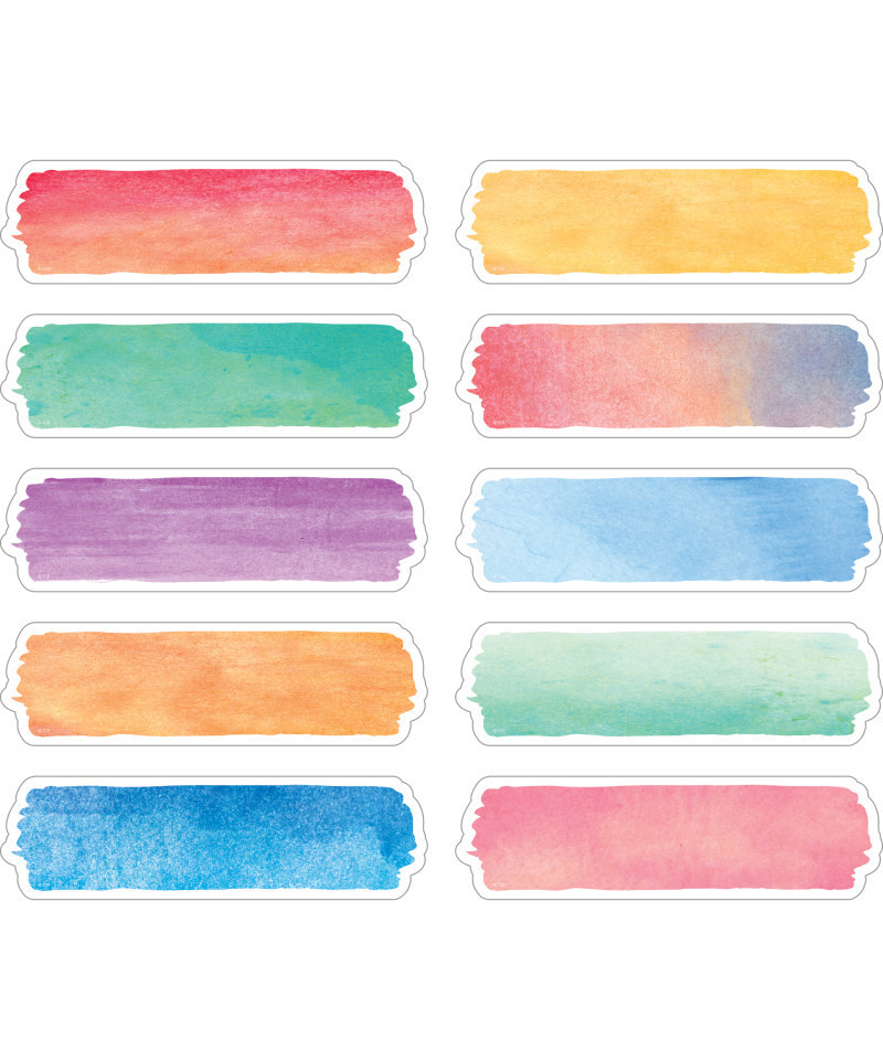 Use these non-adhesive Watercolor Labels on pocket charts, boxes, bins, or student folders. Each piece measures 5-1/4" x 1-1/2". Each pack includes 120 labels: 4 perforated labels per sheet, 30 sheets per pack. Sold as 3 packs for a total of 360 labels.