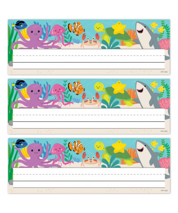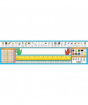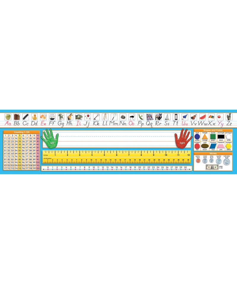 Primary desk plates include photo alphabet line, name plate with left and right handprints, 12" (30 cm) ruler, number line (0 to 30), shapes and colors, money, and counting 1-120 chart. Measures 19" x 5" (48.3 X 12.7 cm). Each pack includes 36 desk plates. Note: this item features Modern Manuscript font.