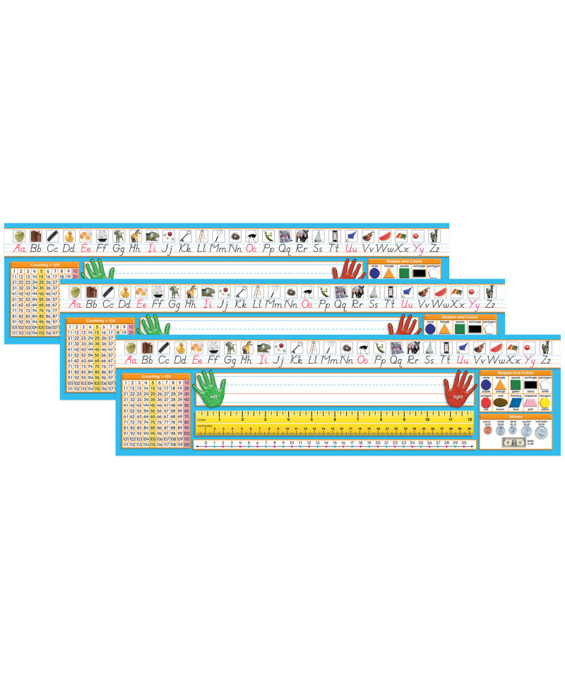 Improve learning levels with handy desk references. Simply write in student names and tape to student desks for year-round use. Primary desk plates include photo alphabet line, name plate with left and right handprints, 12" (30 cm) ruler, number line (0 to 30), shapes and colors, money, and counting 1-120 chart. Measures 19 x 5" (48.3 X 12.7 cm). Note: this item features Modern Manuscript font. Each pack includes 36 desk plates. Sold as 3 packs for a total of 108 desk plates.