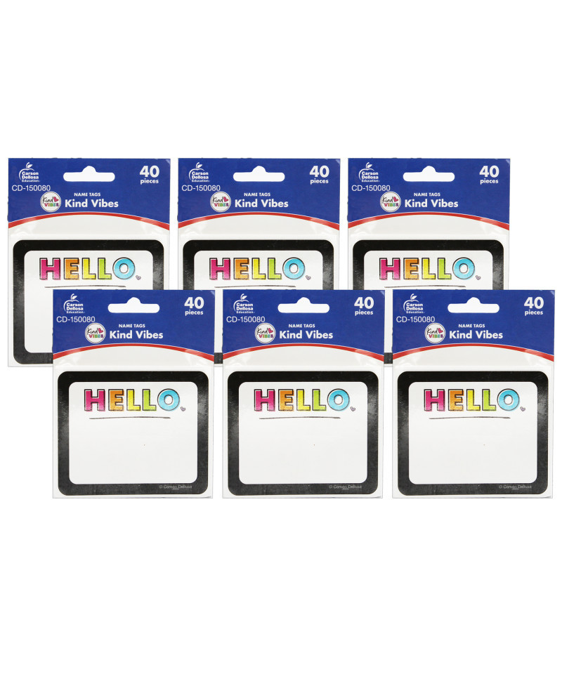 Whether on a field trip or in the classroom, Kind Vibes Name Tags provide a fun and easy way to organize. Each pack includes 40 self-adhesive name tags. Each 3" x 2.5" name tag features plenty of writing space amid a black border, a colorful HELLO, and a heart doodle for a little extra fun. Sold as 6 packs for a total of 240 name tags.