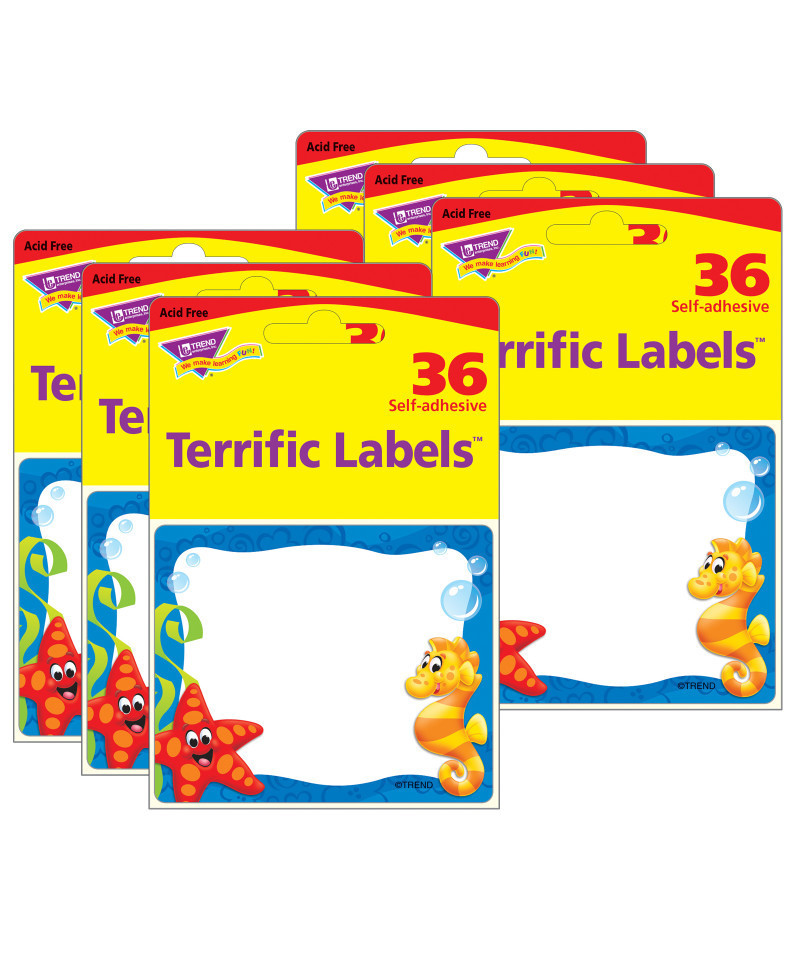 Bright and welcoming labels are acid free and designed for no-smear writing with markers or pens. Perfect for name tags, labels stay put and won't leave residue on clothes! Also great for cubbies, lockers, storage boxes, envelopes, learning centers, and so much more. Self-adhesive. Labels measure 2.5" x 3". Each pack includes 36 labels. Sold as 6 packs for a total of 216 labels. Coordinates with Sea Buddies™ Collection.