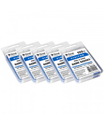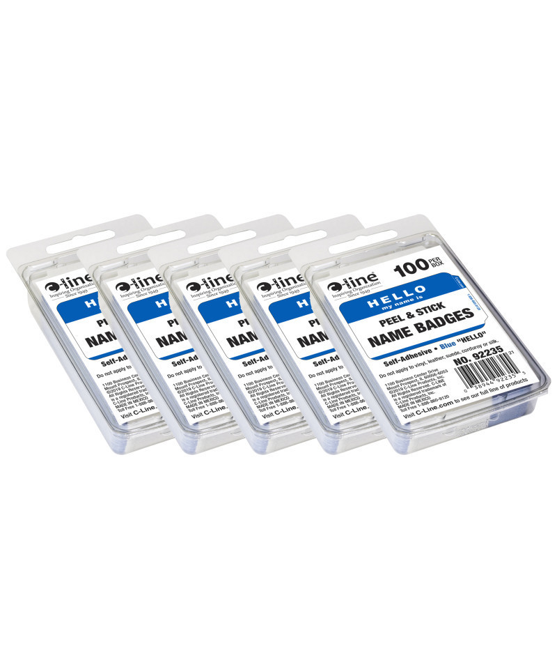 Nothing makes visitors feel welcome like a Hello badge. These pressure sensitive Hello name badges are ideal for small meetings, seminars and conferences. Unique tabbed edge makes it easy to peel off backing paper and apply. Overall badge size: 3 1/2 x 2 1/4. Do not apply to vinyl, leather, suede, corduroy or silk. Blue. Each box includes 100 badges. Sold as 5 boxes for a total of 500 badges.